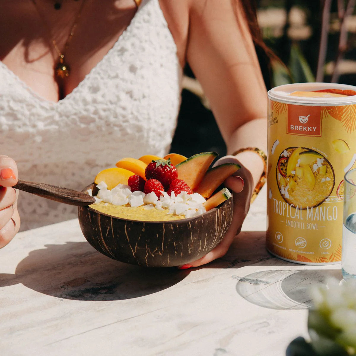 Tropical Mango ist das sommerliche Frühstück, was euch jeden Tag perfekte Urlaubsvibes zaubert. Bestehend aus Mango, Kokosnüssen, Orangen und Limettensaftpulver ist sie super erfrischend und extrem lecker. Durch die enthaltenen Kokosnussflocken hat sie zudem eine besondere Konsistenz, da man jede einzelne Kokosnussflocke direkt wahrnimmt.
