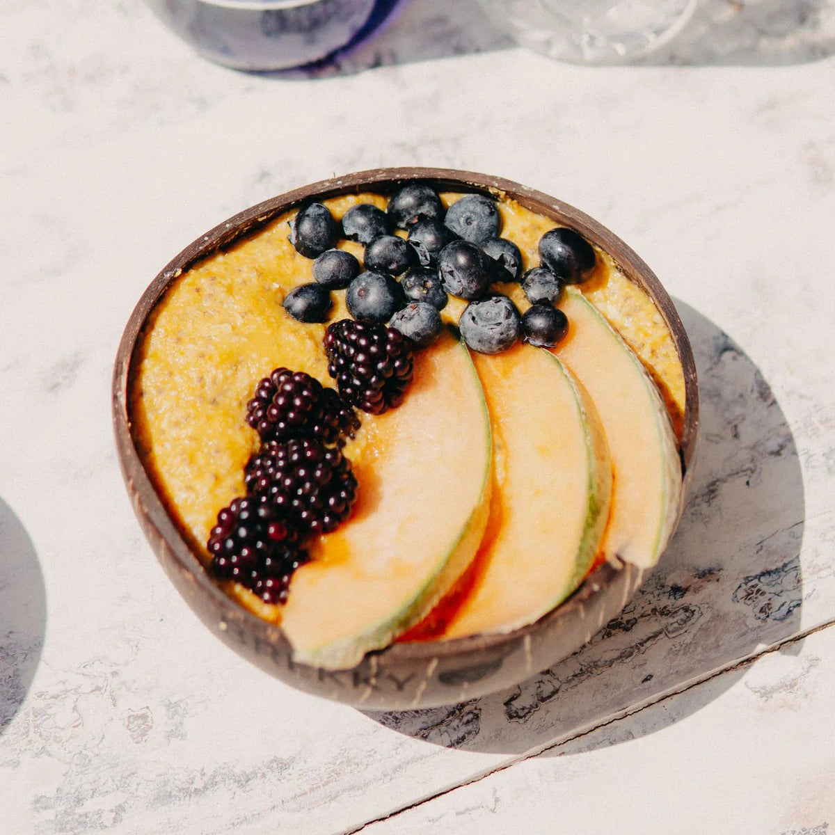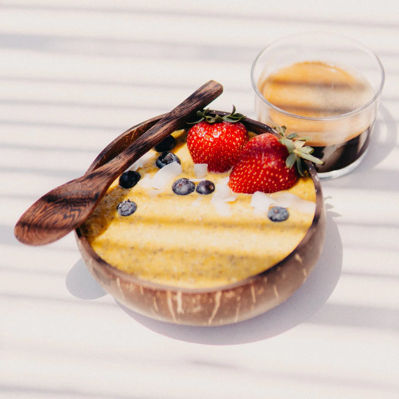 Kokosnüsse sind zudem reich an Eiweiß, Fruchtzucker und Vitaminen. Sie sind nicht nur sehr gesund, sondern auch vielfältig anwendbar. Entweder in Form von Kokosnussflocken, so wie in unserer Bowl, als Kokosnussmilch oder aber als Snack. Eine Kokosnuss besteht überwiegend aus gesättigten Fettsäuren. Im Gegensatz zu tierischem Fett sind die Fette der Kokosnuss nicht lang-, sondern mittelkettig. Diese können vom Körper relativ schnell abgebaut werden und verhindern Heißhungerattacken. Da diese zusätzlich nicht als Körperfett eingelagert, sondern sofort in Energie umgewandelt werden, hilft es daher super beim Abnehmen. Zudem wirken sie sich besonders positiv auf unser Immunsystem aus, denn die antimikrobielle und antivirale Wirkung der enthaltenen Laurinsäure befreit den Körper vor zahlreichen Krankheitserregern. Die Kokosnuss ist auch daher so gesund, weil sie den Cholesterinspiegel senkt.