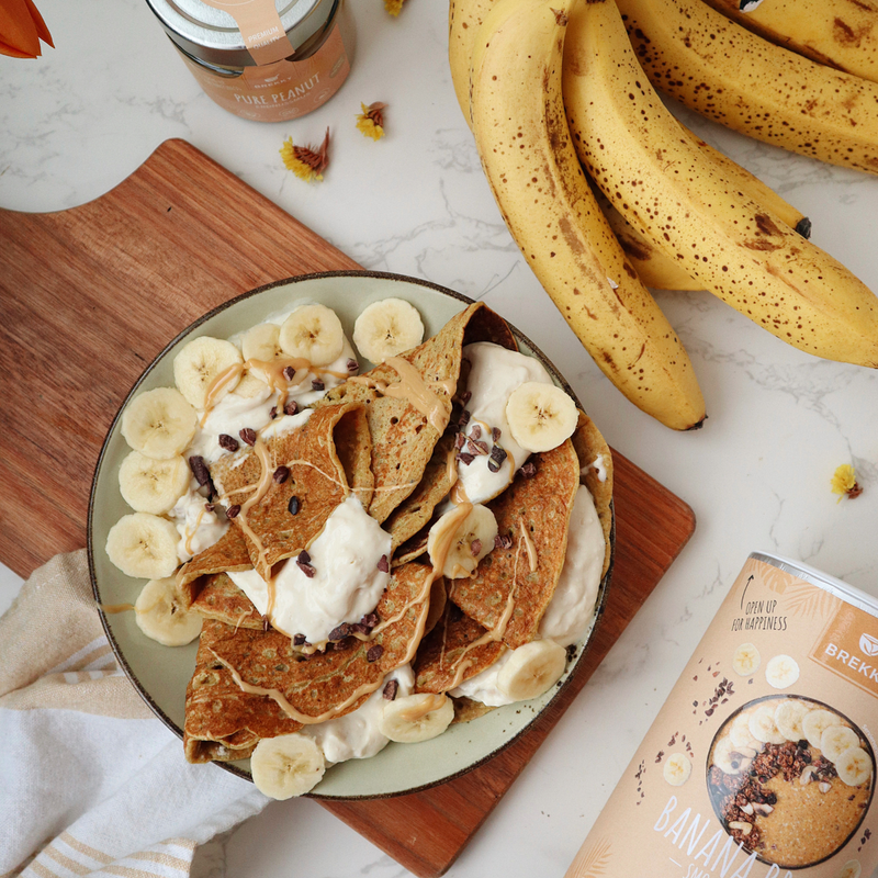- Jeden Crêpe mit der Bananenquarkfüllung bestreichen und dann zusammenklappen oder rollen.