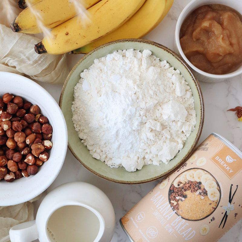 - In einer großen Schüssel vermische Brekky Banana Bread, Dinkelmehl, gemahlene Nüsse und das Backpulver.