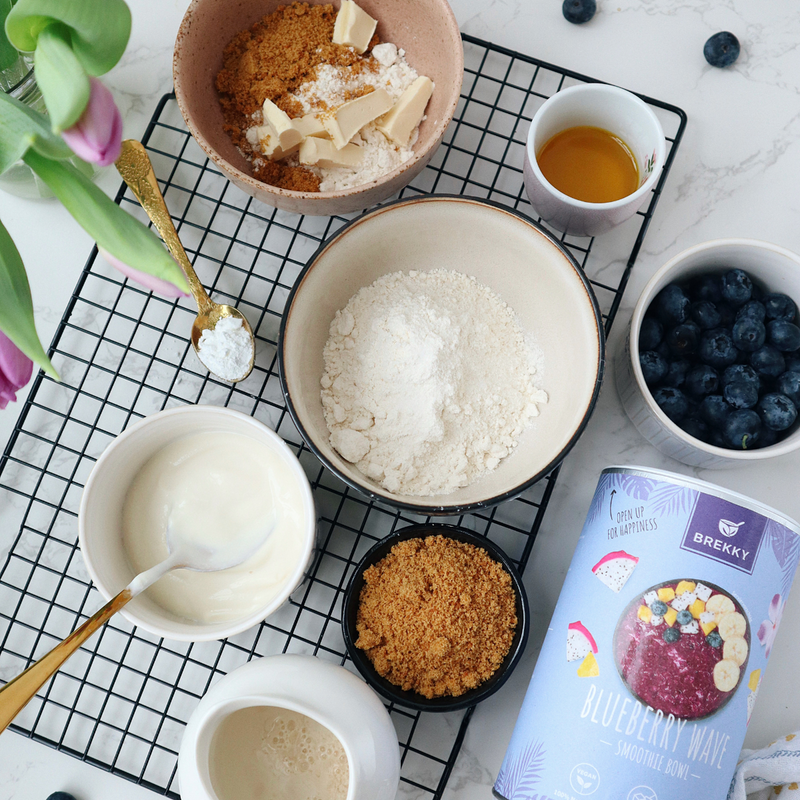 - In einer großen Schüssel Mehl, Blueberry Wave, Salz, Backpulver und Kokosblütenzucker vermengen.