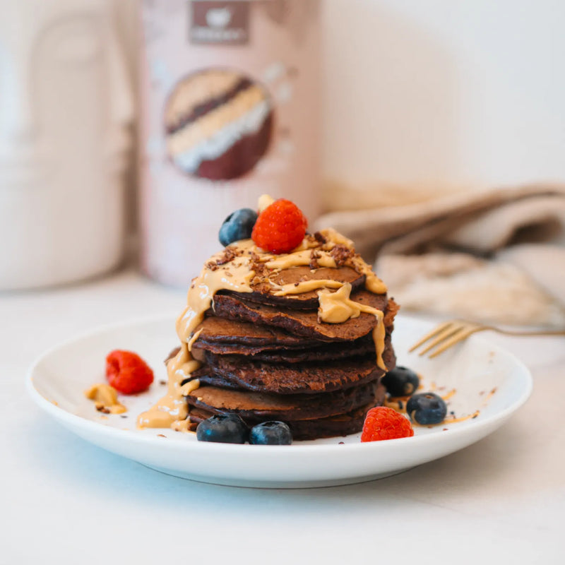 - Fertige Pancakes auf einem Teller mit Puderzucker bestäuben und mit Beerenmischung und unserem Brekky Pure Peanut Erdnussmus anrichten