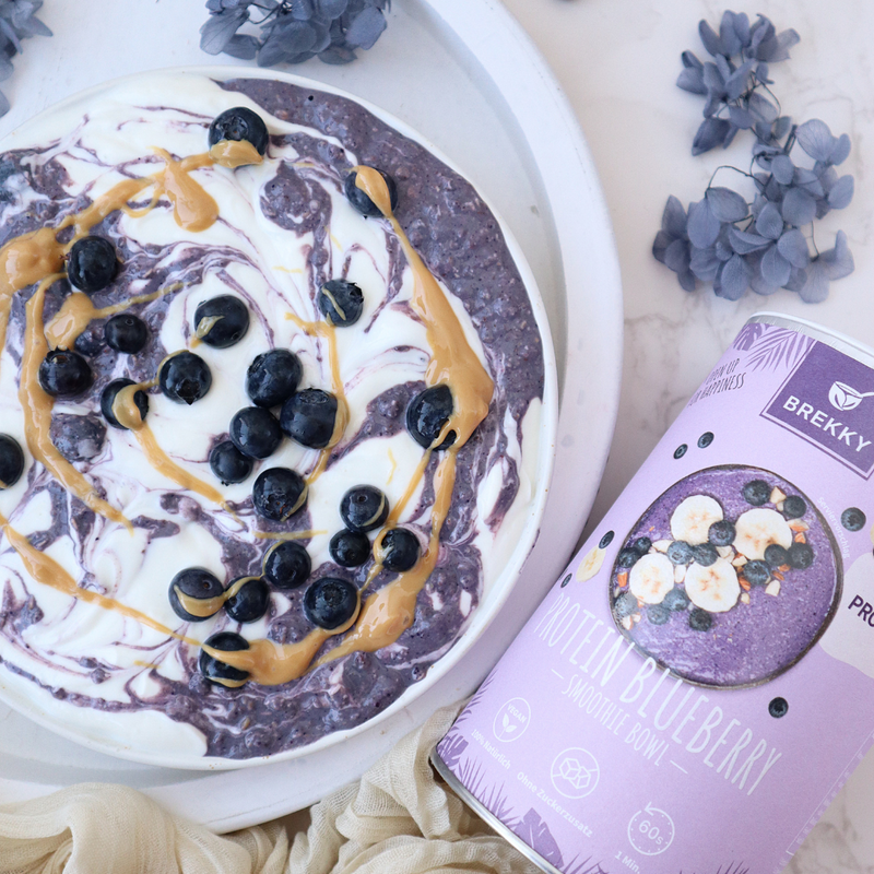 - Toppe die Schichtung mit den restlichen Blaubeeren und einem Teelöffel Nussbutter nach Wahl.