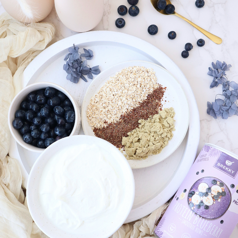 - In einer separaten Schüssel vermische die High Protein Blueberry mit den gemahlenen Leinsamen und den Haferflocken.
