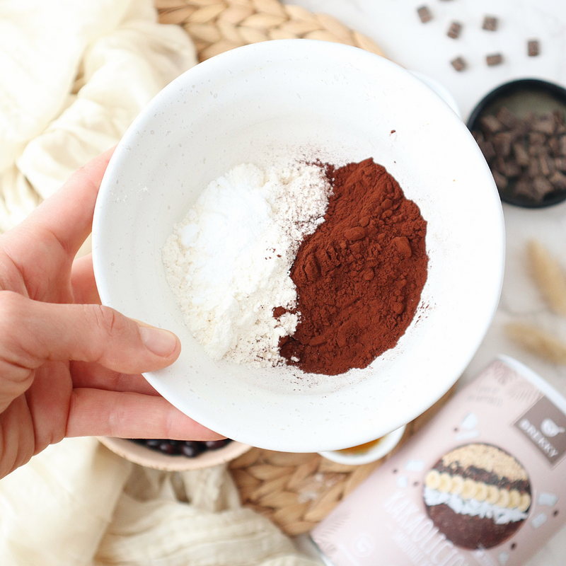 - In einer großen Schüssel BREKKY Kakaolicious, Dinkelmehl, Kakao und Backpulver gut vermischen. Diese Mischung sorgt für die Basis der Brownies.