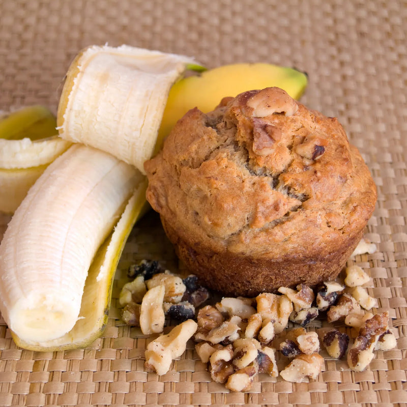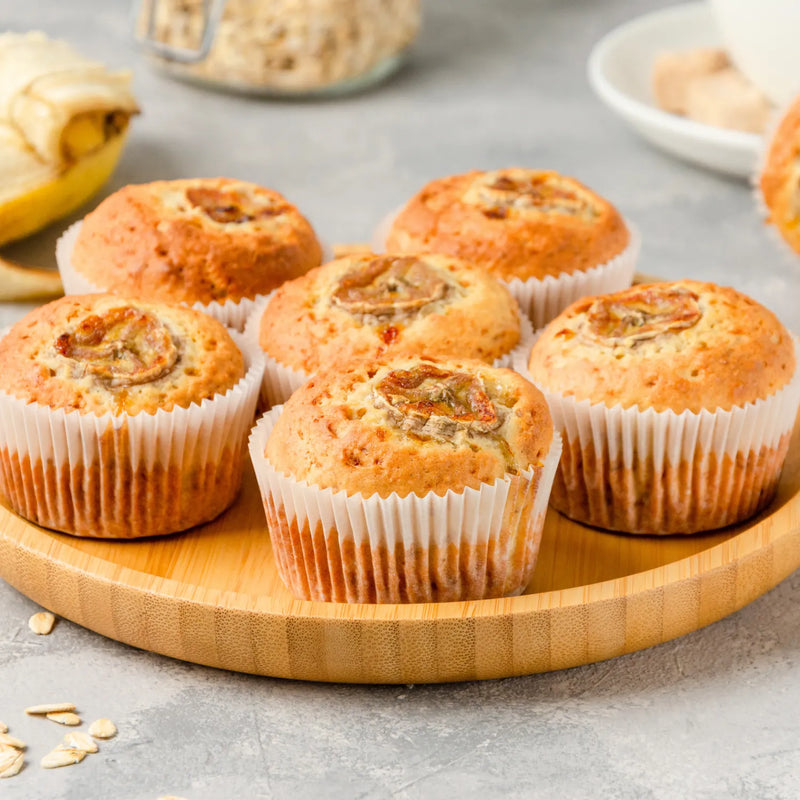 - Optional noch eine mittelreife Banane in Scheiben schneiden und jeweils eine Scheibe auf einen Muffin geben