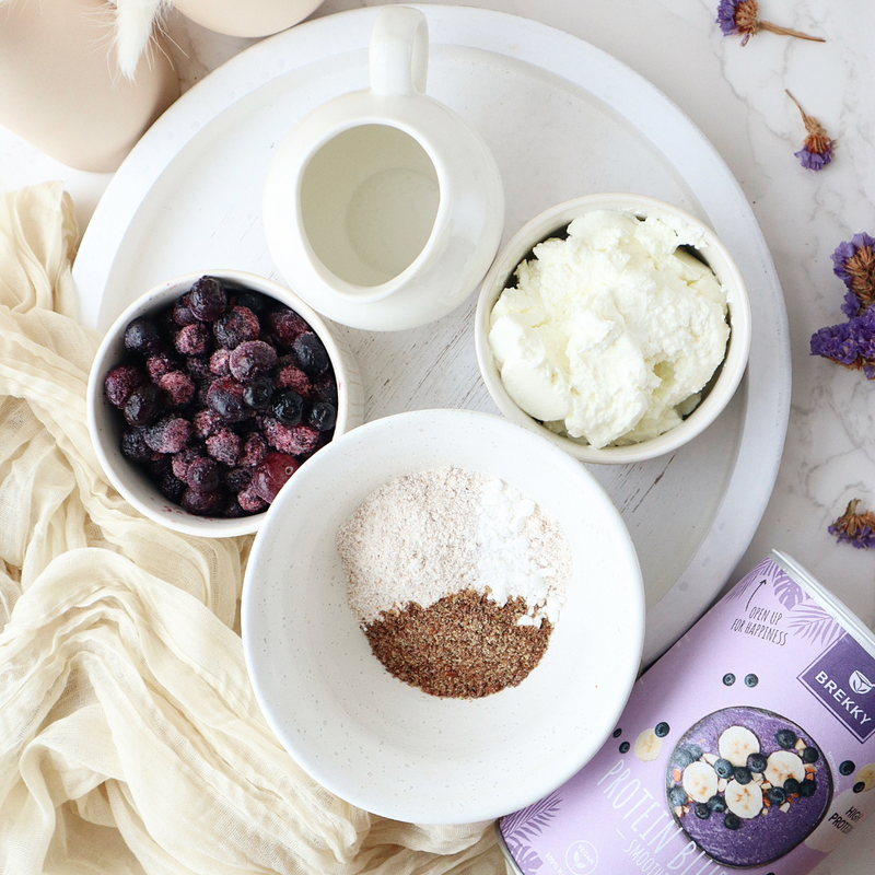 - In einer kleinen Schüssel Sojaquark mit High Protein Blueberry und den restlichen Blaubeeren vermengen.
