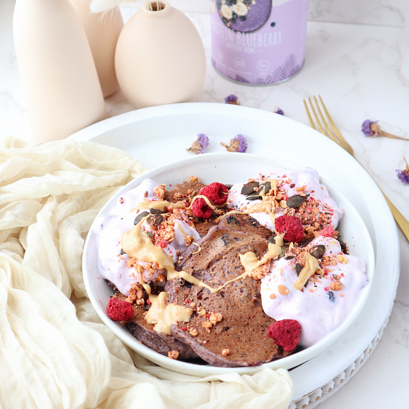 - Die Pancakes auf Teller verteilen und mit dem Blaubeer-Quark-Gemisch und weiteren Toppings nach Wahl servieren.