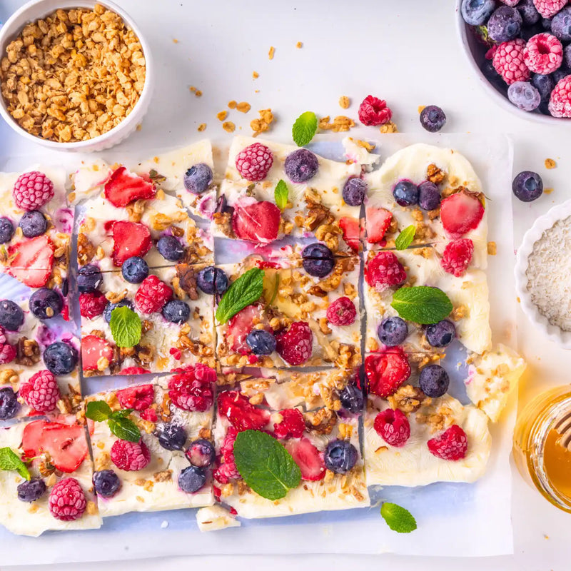 - Die Erdbeeren und Blaubeeren waschen und zusammen mit den Walnüssen auf dem Joghurt verteilen