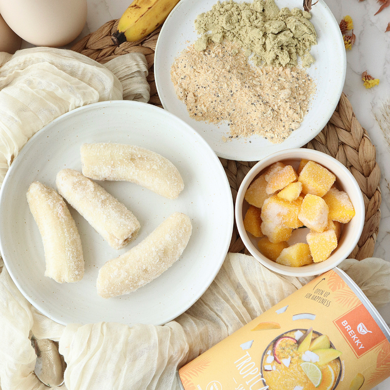 - BREKKY Tropical Mango und Vanille Proteinpulver zu den gemixten Früchten hinzufügen.