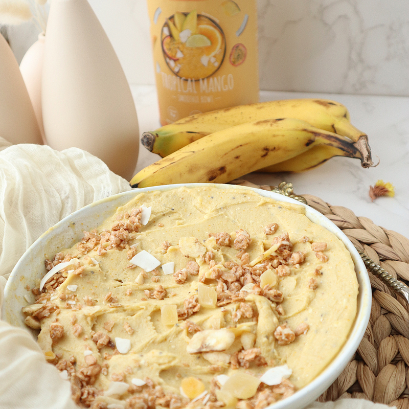 - Nicecream mit dem Tropical Crunch Topping oder anderen Toppings nach Wahl, wie z.B. frischen Früchten, Nüssen oder Kokosraspeln, garnieren.
