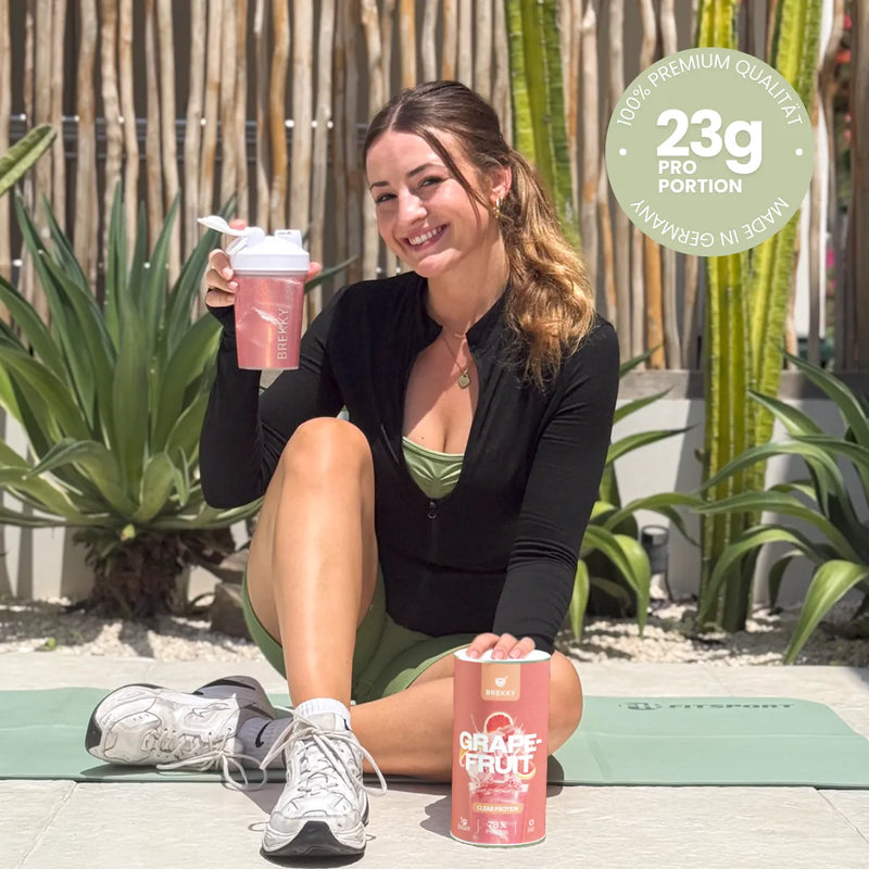 Clear Protein ist ein besonders leichtes Eiweißpulver, das sich in Wasser oder anderen Flüssigkeiten vollständig auflöst und dadurch eine klare, erfrischende Konsistenz erhält – quasi eine Protein Limo. Im Gegensatz zu cremigen Shakes wirkt es weniger süß und angenehm leicht. Damit eignet sich unser Brekky Clear Protein Probierpaket ideal für alle, die eine frische Alternative zu klassischen Proteinpulvern suchen.